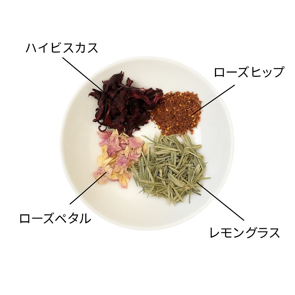 ハイビスカス、ローズヒップ、ローズペタル、レモングラスを組み合わせたブレンド。